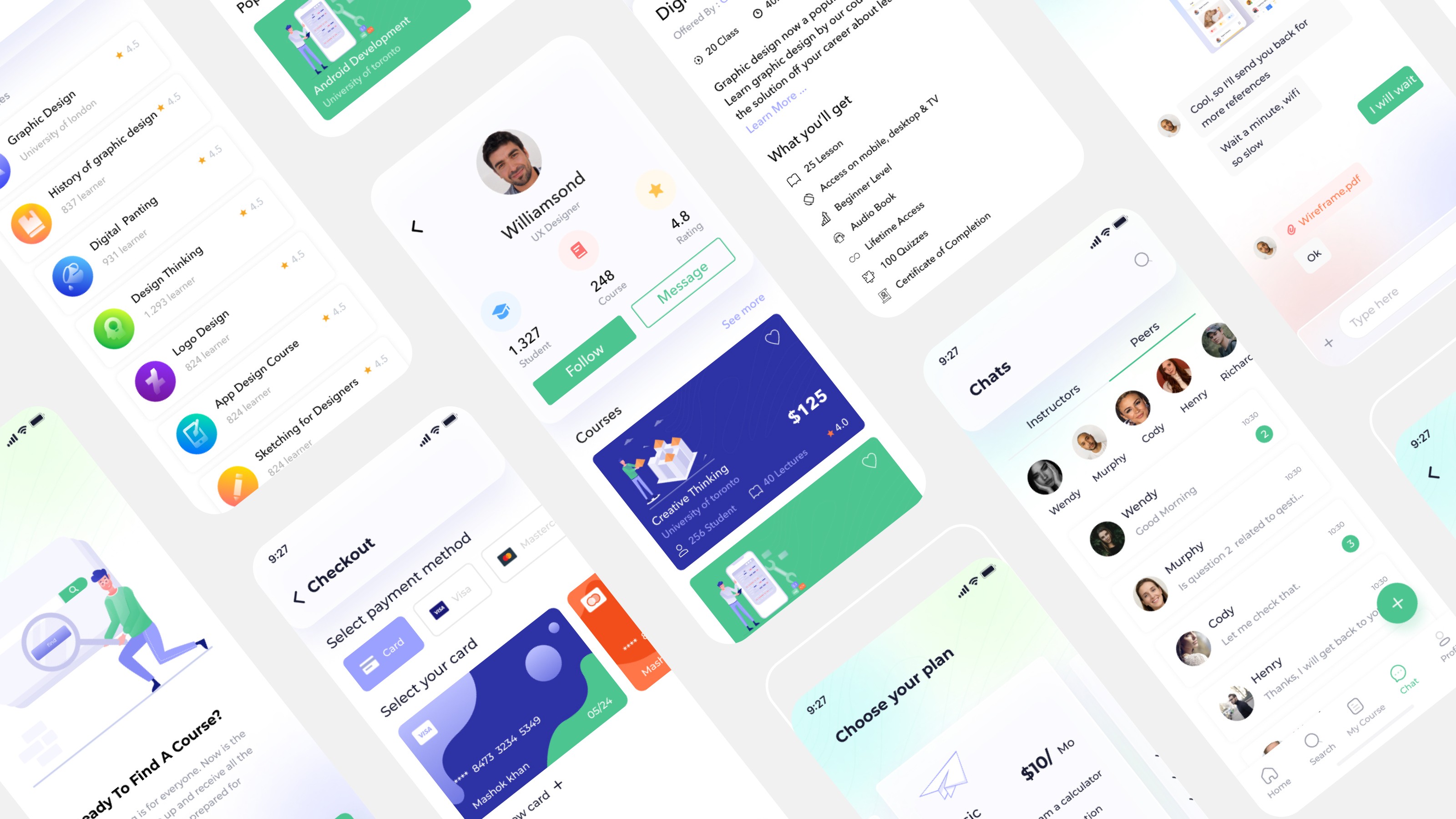 -Designed key screens: course browsing, video player, progress tracking, and quizzes